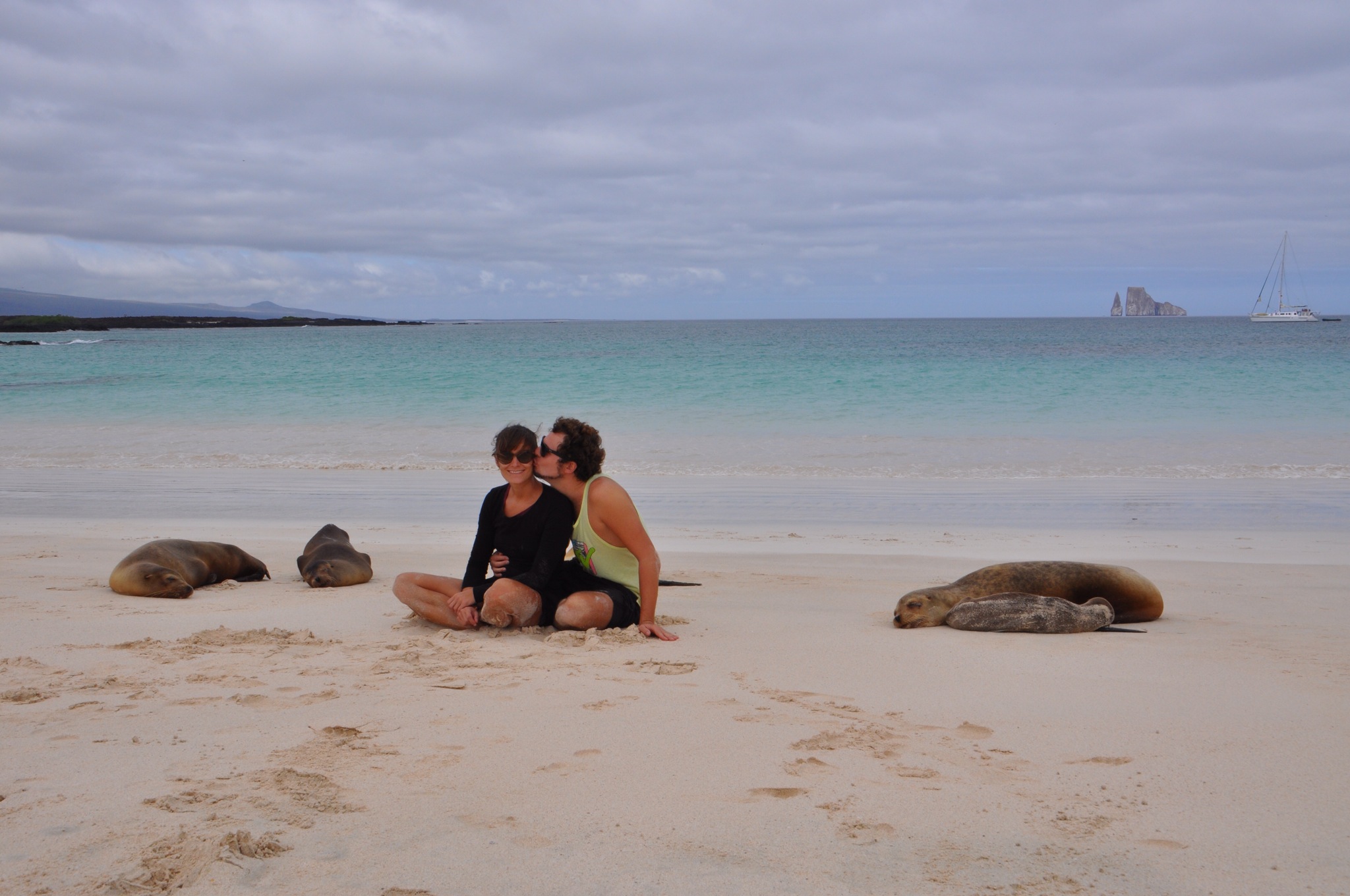 In der Nacht segelten wir zur Insel San Cristobal, wo wir am nächsten Tag zum ersten Mal auf Seelöwen an Land stiessen und später beim Kicker Rock tiefsee-schnorcheln gingen. Denn wir gingen nicht vom Land her ins Wasser, sondern vom kleineren Boot aus. Das Schorcheln fand dann im Tauchanzug statt. Denn das Wasser war, meiner Meinung nach, eiskalt! Brrr….Auch im Wasser erlebten wir die Tierwelt von ihrer schönsten Seite. Wir sahen diverse Fische, neugierige Seelöwen unter Wasser, welche einem Luftblasen ins Gesicht blasen, Galapagos- und Weissspitzenriffhaie, Rochen, Wasserschildkröten. Und dies in unmittelbarer Nähe. Die ganz Mutigen unter uns, gäll Chrigi, „jagten“ die harmlosen Weissspitzriffhaie sogar 🙈.